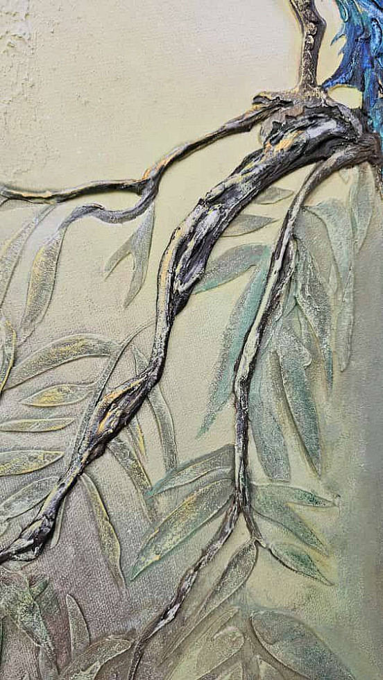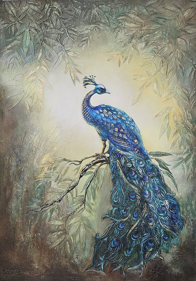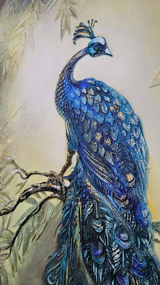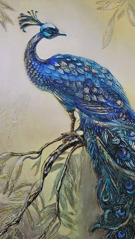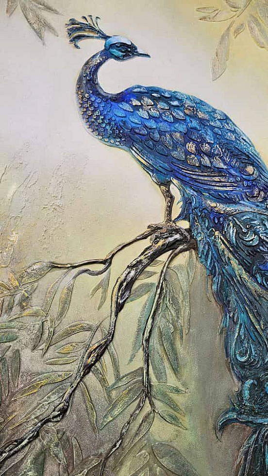 При желании можно нанести детальный трафарет третьим слоем и продублировать необходимые элементы более фактурно для выразительности. Посадить павлина можно на отдельный трафарет — колонну. ветку или просто создать ему достойное обрамление.
